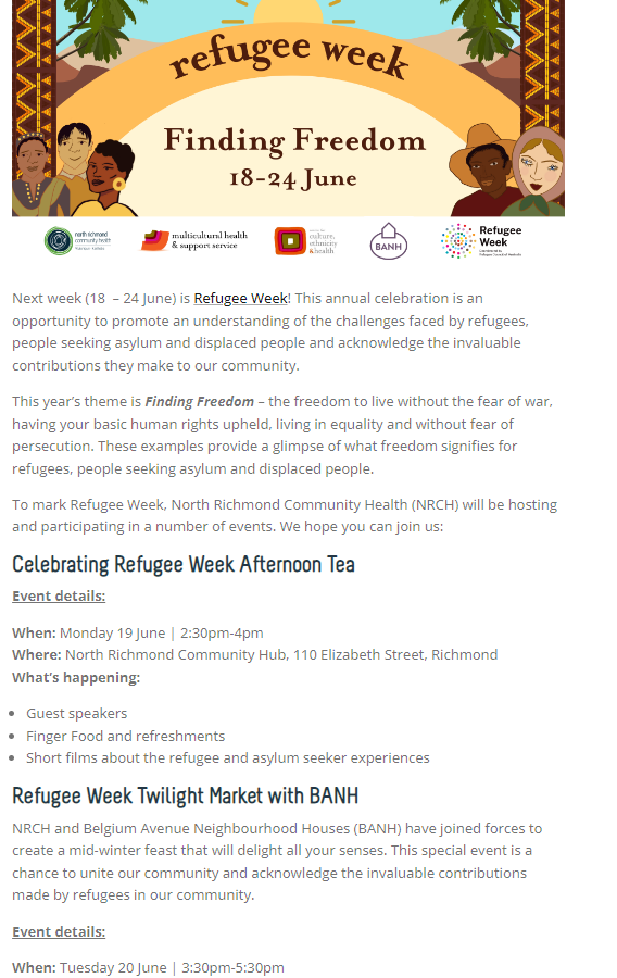 호주에서의 난민 주간 (Refugee week)는 그 주의 일요일에서 토요일까지, 올해 2024년은 6월 16일 (일요일)에서 6월 22일 (토요일)까지입니다. 매년 6월 중순에 열리는 난민 주간. 난민에 대해 더 자세히 알아가고 난민을 그 지역 커뮤니티로 받아들여 함께 통합되어 가는 과정에 열리는 지역사회 이벤트입니다. 물론 호주 전역에서 열리고요.