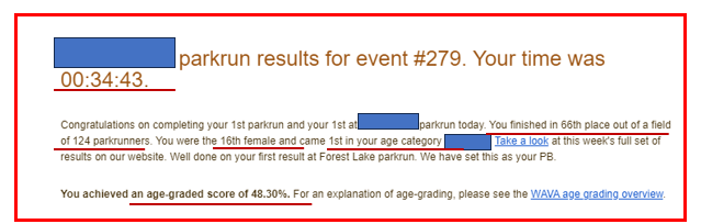 "해석해 보면, 5Km 기록은 34분 43초, 너의 첫 번째 파크런 달리기, 124명 중 66번째로 들어왔고, 여성 중에서는 16번째. 너의 나이 카테고리 (5살씩)에서는 첫 번째로 들어왔다. 너의 성별, 연령에 맞는 세계기록 시간을 활용하여 점수 (퍼센트)를 산출한 연령등급은 48.3%에 속한다"